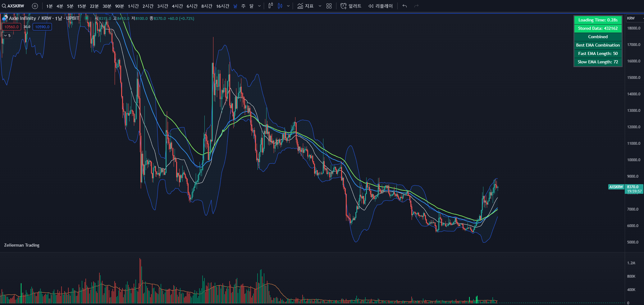 엑시인피니티 같은 경우는 P2E 테마에서는 상당히 유명하기 때문에 테마시즌이 오면 높은 상승율을 보여주고 있습니다. 기술적으로도 현재 하락세를 멈추고 상승전환의 모습을 보여주고 있기에 단기적인 매매에는 긍정적인 상황입니다.